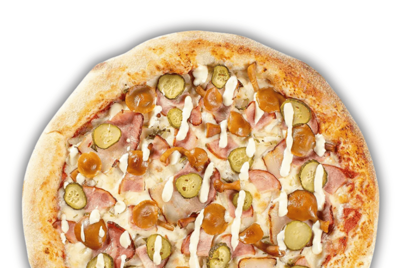 бекон • шинка • цибуля Марс • моцарела • огірок маринований • опеньки • томатний соус (основа)