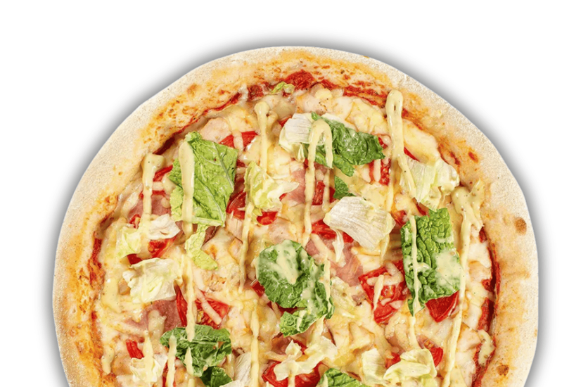 Пармезан • бекон • курка гриль • моцарелла • помідор • салат Айсберг • соус Цезар • томатний соус (основа)